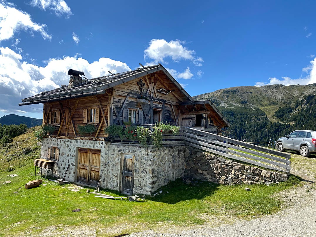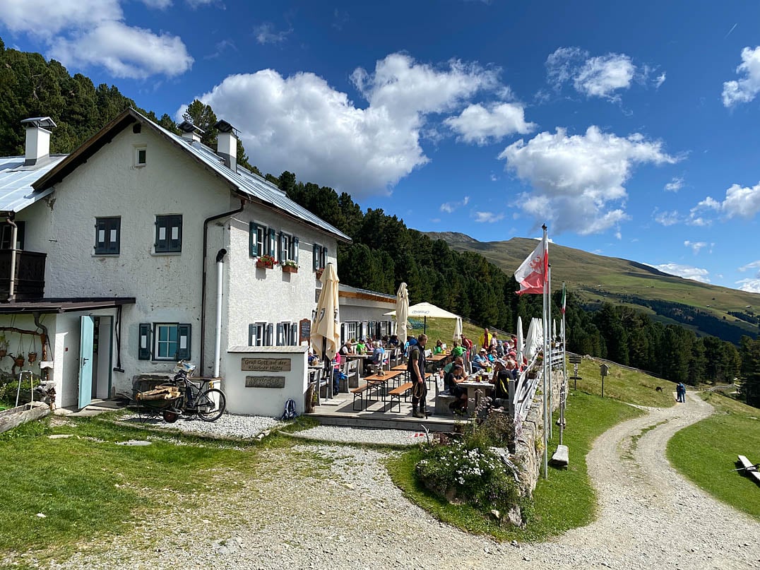 Nach einer gemütlichen Rast auf der großzügigen Terrasse des Schutzhauses geht es auf bekannter Strecke zurück zum Ausgangspunkt. Bei der Abfahrt ist aufgrund des starken Gefälles vom Latzfonser Kreuz abwärts gepaart mit dem ruppigen Untergrund Vorsicht geboten! Der Rest verläuft gemütlich auf dem gut beschaffenen Fahrweg bis hin zum Parkplatz Kühhof.