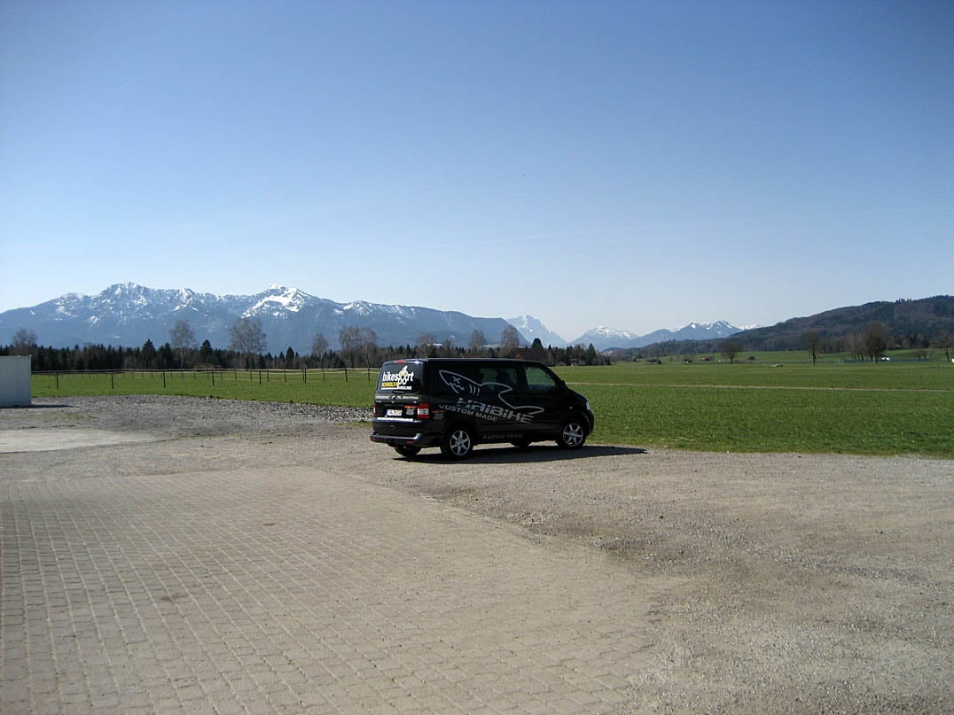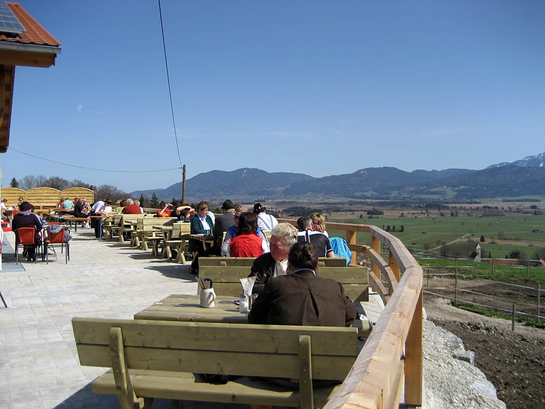 Wir biegen noch vor der Brücke rechts ab und fahren weiter in Richtung Norden. Nach circa einem Kilometer verläuft die Straße leicht rechts und leitet uns schließlich einen weiteren Kilometer bis kurz vor den kleinen Eichsee. Den kleinen Badesee umfahren wir entlang seines rechten Ufers über einen verwitterten Feldweg, biegen anschließend links ab und halten uns nach einem halben Kilometer rechts. Etwa eineinhalb Kilometer weiter erreichen wir Zell, einen Ortsteil der Gemeinde Großweil im Landkreis Garmisch-Partenkirchen. Um auf dieser Tour auch ein paar Höhenmeter zu gewinnen, folgen wir der Dorfstraße nach Zell hinein und biegen anschließend rechts in die Pöltner Straße. Eine Brücke führt uns über die Autobahn A-95 hinweg. Anschließend fahren wir linker Hand über die Sterner Straße etwa achzig Höhenmeter hinauf zum kleinen Weiler Stern. Dort befindet sich das Hof Café am Stern (697m), welches durch seine aussichtsreiche Sonnenterrasse weite Blicke über das durchfahrene Gebiet und die Berge des Voralpenlandes im Hintergrund zulässt.