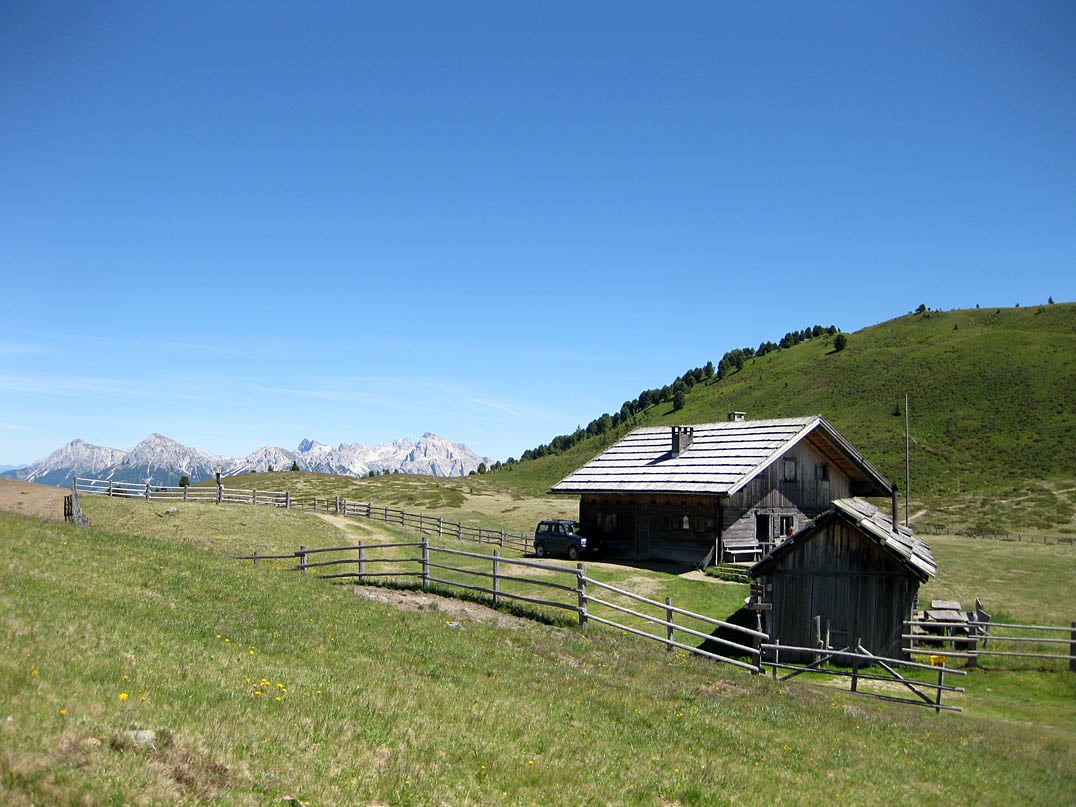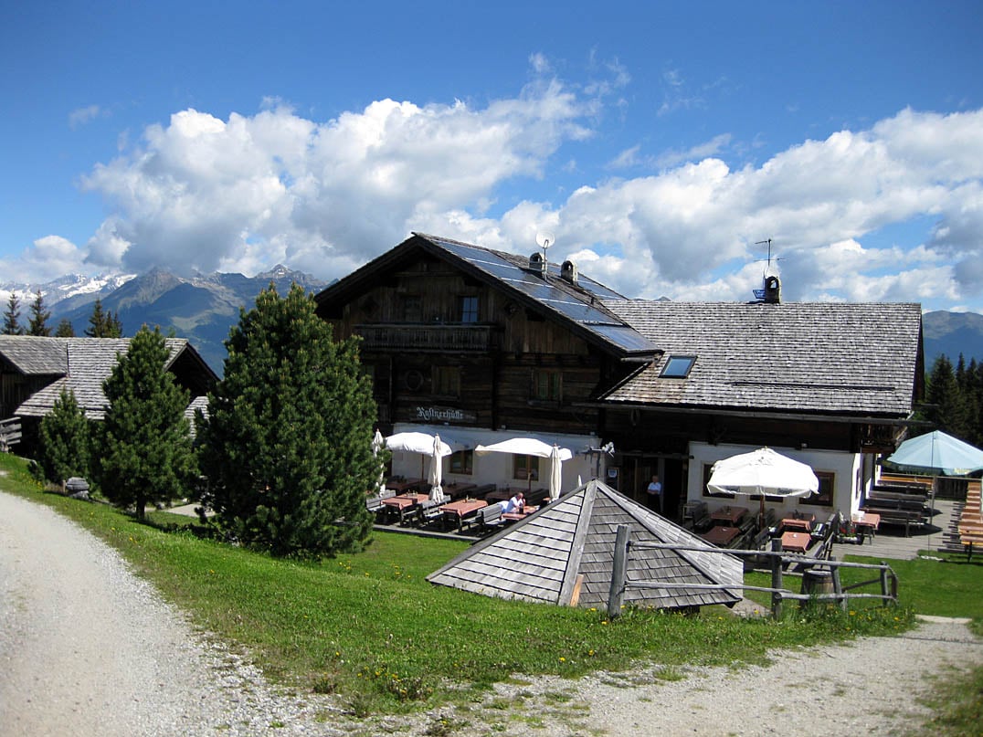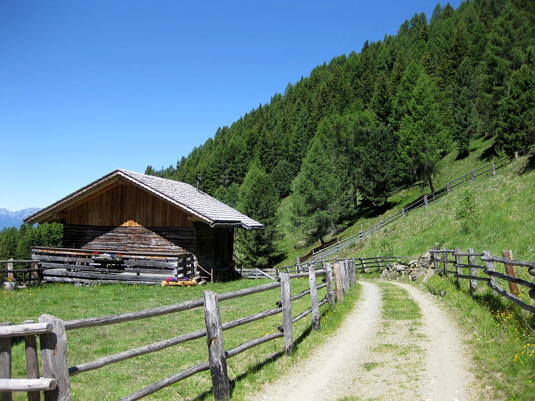 Vom Parkplatz Herol aus geht es links über den Wanderweg Nr. 3 in Richtung Lüsner-Rodenecker Alm, Astjoch und Kreuzwiesenhütte. Vorbei an der Reaswiesenhütte (1660m) fahren wir gemächlich durch den Nadelwald bis zur Abzweigung Plansolalm (1814m), die wir sprichwörtlich links liegen lassen und somit geradeaus über den markierten Wegpunkt Tulper-Gampis in eines der größten Hochplateaus Europas, die Rodenecker-Lüsner Alm, gelangen. Wir folgen dem Fahrweg gemäß Wegweisern geradeaus in Richtung Rastnerhütte. Dieser wird im weiteren Verlauf deutlich schlechter. Besonders in der Nähe des Weidegatters ist mit Wurzeln und Auswaschungen zu rechnen. Keine unüberwindbaren Hürden jedoch, weshalb wir etwa siebenhundert Meter später den Mittelpunkt der Rodenecker Alm erreichen.