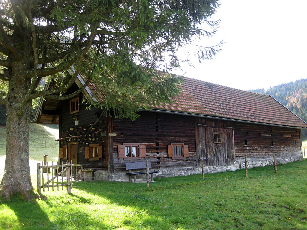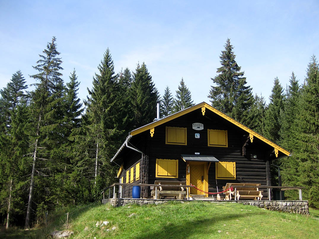 Die unbewirtete Selbstversorgerhütte der Sektion Neuland des Deutschen Alpenvereins liegt etwas hinterhalb des grasbewachsenen Aussichtshügels inmitten des Almgebiets rund um die etwas südlich gelegene, ebenfalls nicht bewirtete Längenbergalm (1210m). Am westlichen Ende des kleinen Hügels entdecken wir ein steinernes Denkmal, welches den Verstorbenen und Gefallenen der Sektion Neuland gewidmet ist. Vom "Bankerl" nebenan bietet sich ein einmaliger Blick auf die Benediktenwand (1801m) im Südwesten, sowie auf die vorgelagerte Probstenwand (1614m) und über die steinernen Gebilde der Achselköpfe (1709m) und des Latschenkopfes (1670m) bis hin zum Brauneck (1555m) im Südosten.