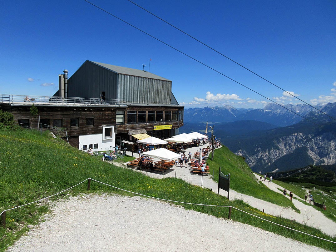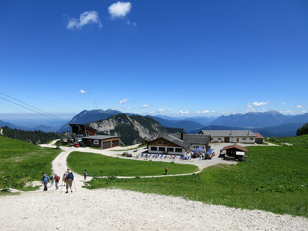 Bis zur bewirteten Kreuzalm (1600m) am Fuße des Kreuzjoch (1719m) ist es nur mehr ein knapper Kilometer. Von dort geht es hinauf in Richtung Kreuzeckhaus (1651m) und der Bergstation der Kreuzeckbahn. Anstatt jedoch auf diese zu zufahren, halten wir uns links und lassen uns ein paar Meter hinabrollen. Mit Blick auf die imposante Nordwand der Alpspitze (2628m) und das Wettersteingebirge im Süden treten wir weiter bergauf und gelangen so zur ebenfalls bewirteten Hochalm (1703m), die auch unter der Woche von zahlreichen Wanderern besucht wird. Kein Wunder, schließlich befindet sich unmittelbar neben der Almwirtschaft die Talstation der Hochalmbahn, die einen im Halbstundentakt bequem hinauf zum Alpspitzhaus befördert.