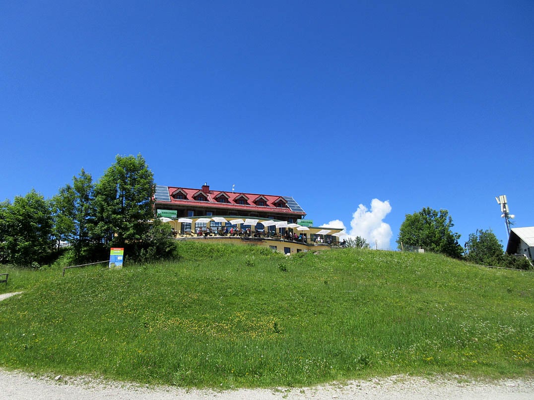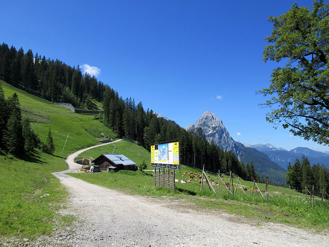 Schon bald darauf durchqueren wir freie Wiesenhänge, die im Winter als Skipisten dienen. Und so kommt es auch, dass wir schließlich an der Sesselliftanlage Kandahar-Express vorbeifahren und dabei ein paar Blicke hinunter ins Tal Richtung Grainau erhaschen. An der darauffolgenden Weggabelung unmittelbar hinter einem Weidegatter weist uns die Beschilderung nach links weiter. Während die flachere Passage gerade eben noch wohltuende Abwechslung war, geht es anschließend etwas mehr als zweieinhalb Kilometer bergauf bis zu einer weiteren Abzweigung, der wir nach rechts folgen.