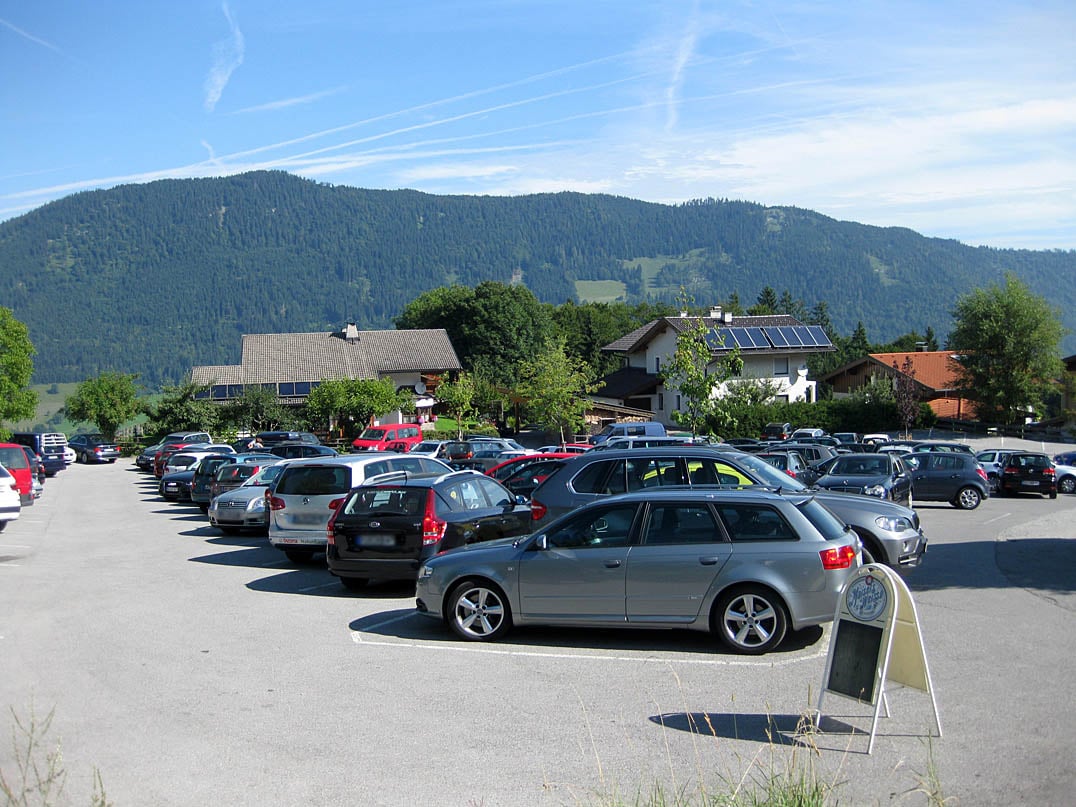 Von nun an kann man nicht mehr viel verkehrt machen und so treten wir die folgenden eineinhalb Kilometer durch den Bergwald hinauf. Nachdem wir einige hundert Höhenmeter hinter uns haben, lichten sich auch langsam die Schatten des Waldes, hier und da lassen sich sogar ein paar Blicke auf das Thierseetal und das gegenüberliegende Trainsjoch (1707m) erhaschen. Bei etwa der Hälfte der Auffahrtsstrecke erreichen wir die Kala Alm (1425m). Die Jausenstation liegt inmitten einer überschaubaren Almwiese und lockt vorallem durch einen herrlichen Ausblick auf das in der Ferne thronende Hintere Sonnwendjoch (1986m).