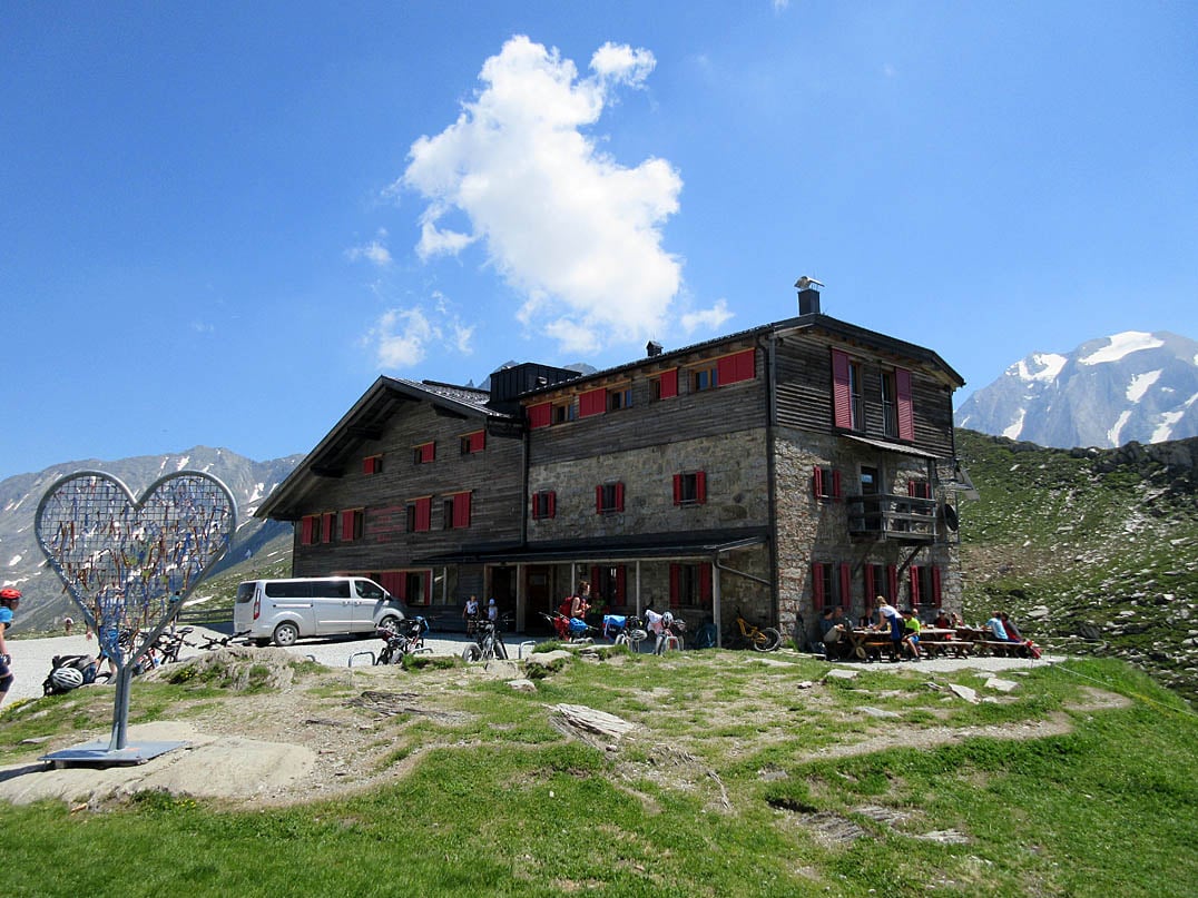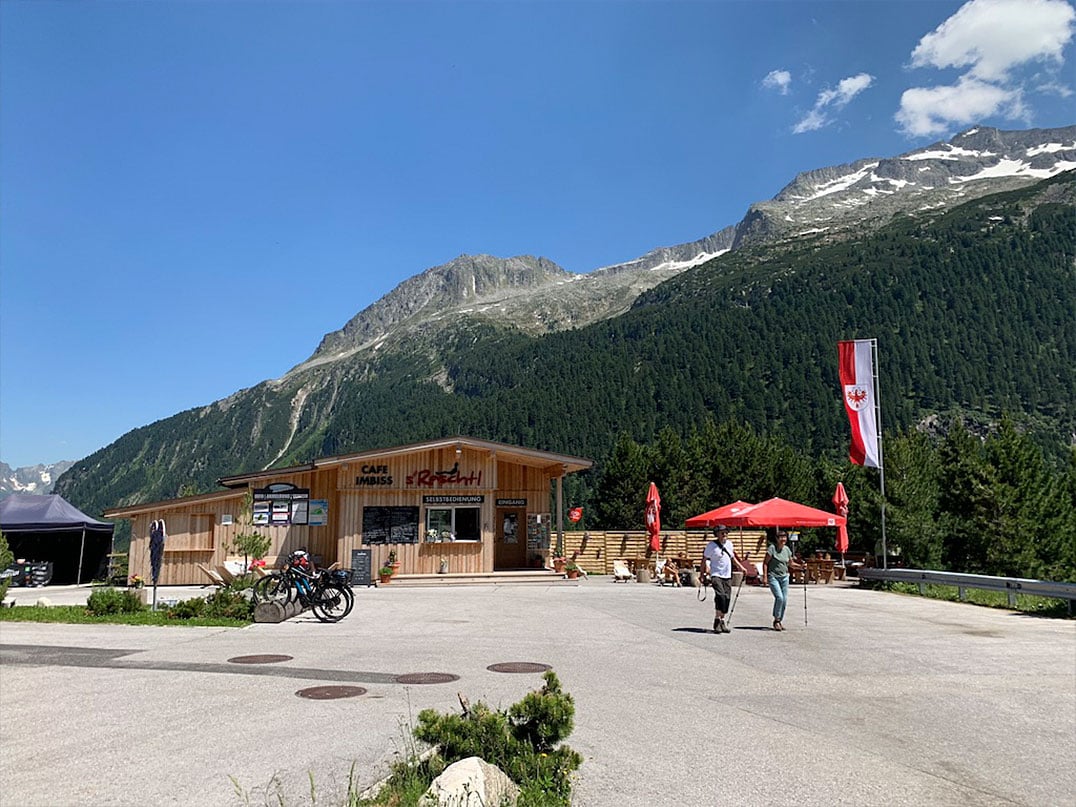 Sobald mal den Blick vom Grenzübergang (ital. Passo di Vizze) etwas nach hinten verlagert erkennt man auch schon das Pfitscherjochhaus (2276m), den höchsten Punkt und zugleich Ziel unserer Tour. Nur mehr dreihundert Meter später stehen wir auch schon dort oben und blicken hinab ins Pfitscher Tal, über welches man nach Sterzing in Italien abfahren kann. Wir genießen das eindrucksvolle Panorama ringsum, kühle Getränke und das köstliche Essen. Das haben wir uns zweifelsohne verdient!