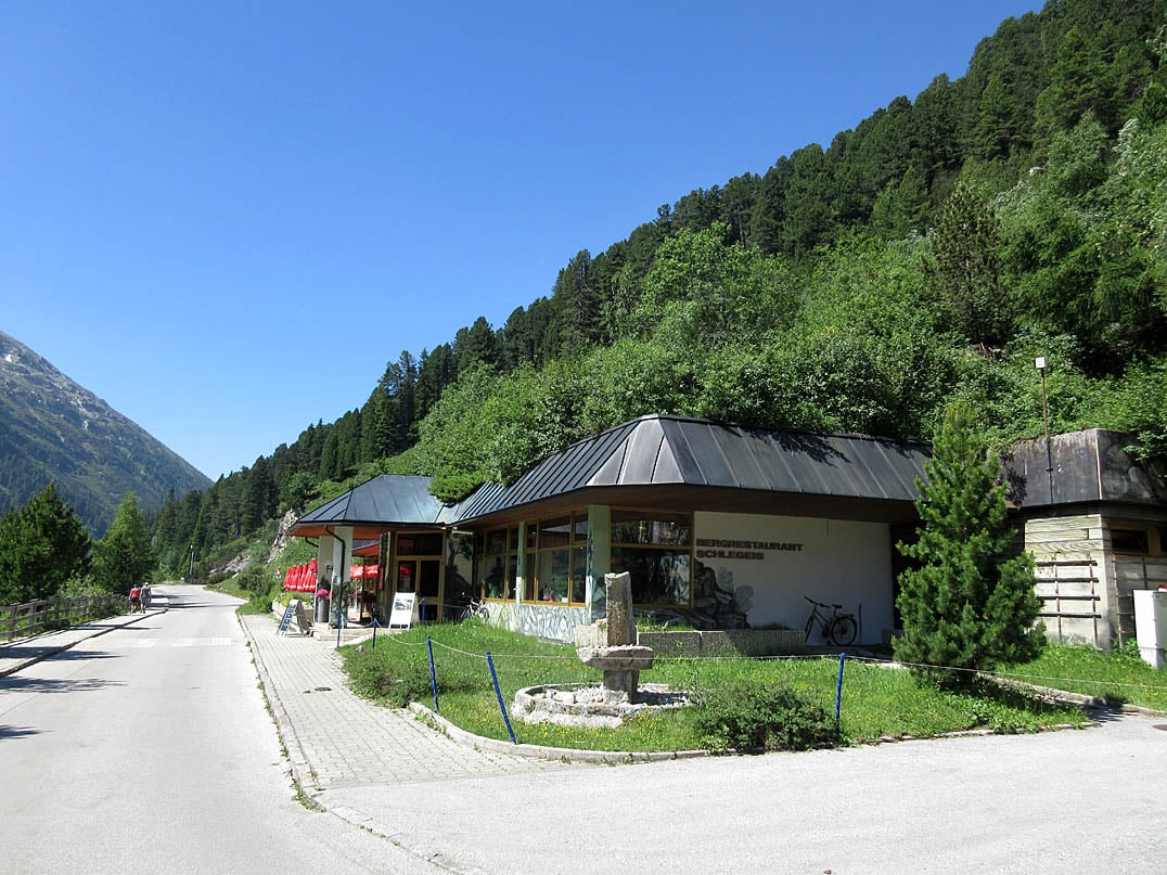 Vom im Jahre 1896 erbauten Alpengasthof Breitlahner (1257m) am Zemmbach geht es über die Teerstraße nur wenige Meter Richtung Mauthäuschen der kostenpflichtigen Zufahrtsstraße hinauf zum Schlegeis-Stausee. Unmittelbar vor der Station zweigt rechts ein beschilderter Forstweg ab, welchem wir nach Umfahren der Schranke dort schließlich zunächst ein paar Kehren bergauf folgen. Nach etwas mehr als einem Kilometer bei moderater Steigung zeigt uns ein blaues Schild die Weiterfahrt entlang der "Radstrecke Schlegeis".