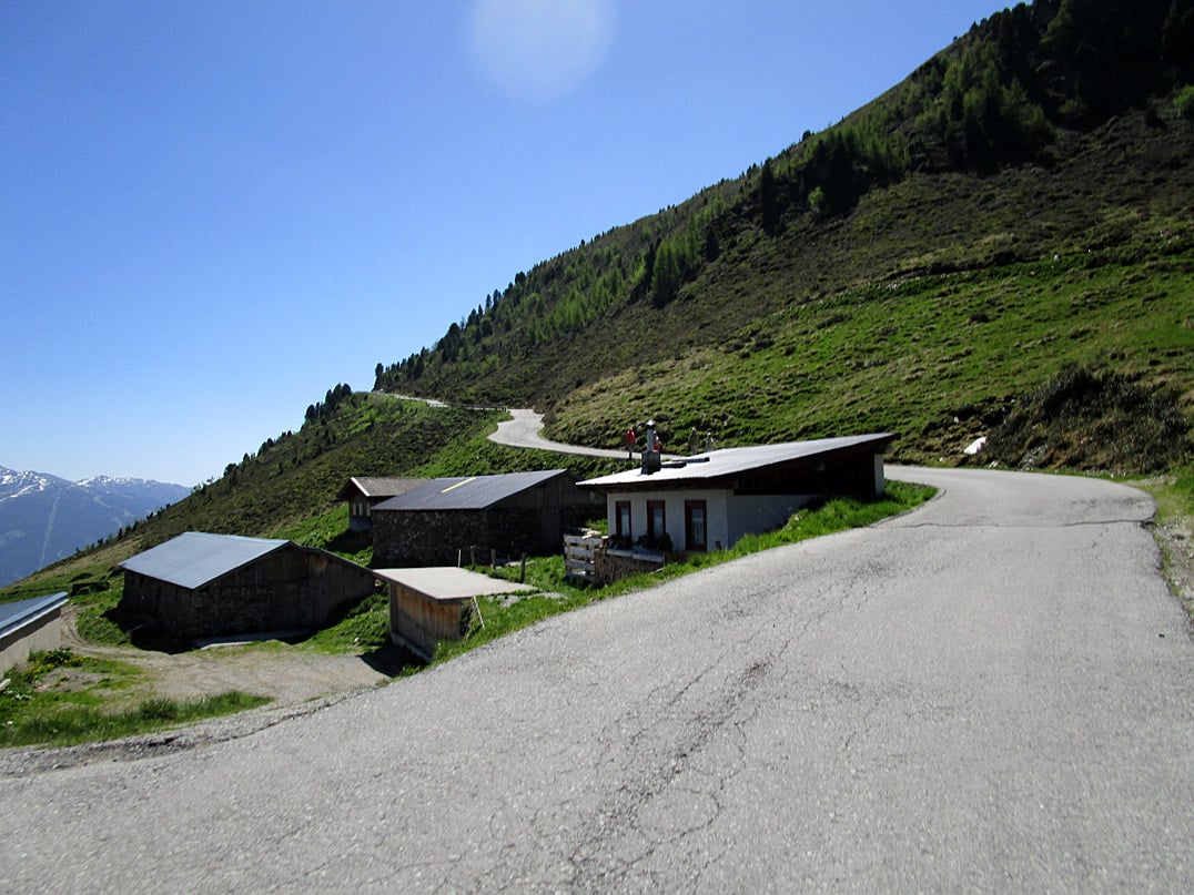 Mit durchschnittlich zwölf Prozent Steigung verläuft die asphaltierte Bergstraße nun von der Gemeinde Zellbergeben über die Fraktion Zellberg bergauf. Vorbei an zahlreichen, am Hang gelegenen Häusern erreichen wir nach etwa zweieinhalb Kilometern das Gasthaus Schulhaus (852m). Nur etwa dreihundert Meter später gabelt sich der Weg. Ein Schild "Auffahrt zur Zillertaler Höhenstraße" weist uns den Weg und so halten wir uns links. Weiter geht es kontinuierlich bergan, begleitet von einer immer besser werdenden Aussicht über den sich bis hinein in den Zillertaler Talschluss schlängelnden Ziller. Nach etwa zwei Kilometern biegen wir in Burbach gemäß Beschilderung "Zillertaler Höhenstraße" links ab.