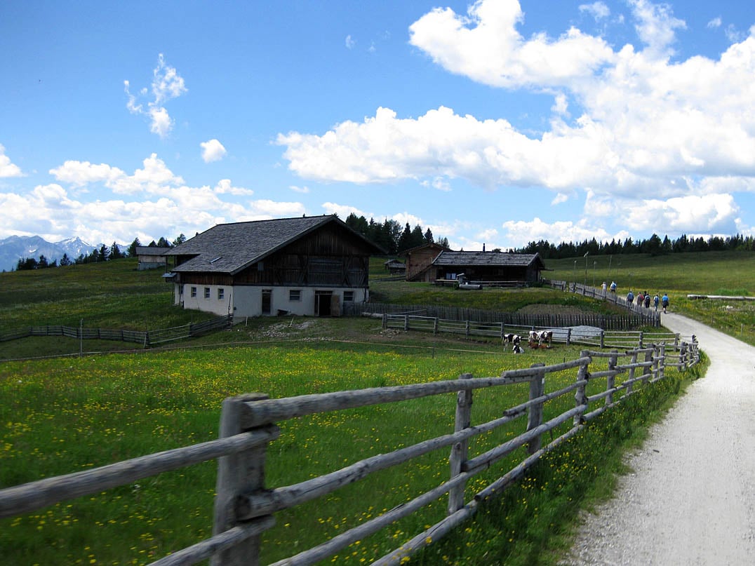 Vor uns breitet sich nun das landschaftliche Idyll des Hochplateaus aus, eingerahmt in die aussichtsreiche Bergwelt der Dolomiten. Weit im Hintergrund erblicken wir den Peitlerkofel (2875m), bekanntes Wahrzeichen der Region und Teil des Naturparks Puez-Geisler. Im gemütlichen auf und ab folgen wir dem Fahrweg vorbei an den landwirtschaftlichen Gebäuden der Leier Alm (1880m) stets in Richtung Astjoch (2194m), dem grasigen und zugleich höchsten Gipfel der Rodenecker-Lüsner Alm.