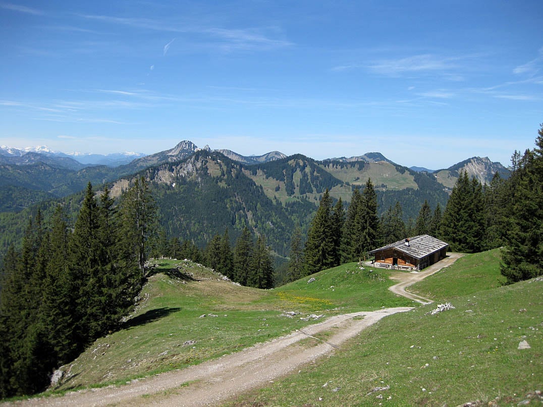 Über einen ausgedehnten Zubringer der unterhalb der Rotwand (1884m) in einem langgezogenen Rechtsbogen bei mäßigem Niveau bergauf führt, legen wir schließlich noch etwa einen Kilometer zurück und erreichen das Rotwandhaus (1737m), imposant und aussichtsreich gelegen am Ende der breiten Zufahrtsstraße. Von der südseitigen Sonnenterrasse genießt man bei guter Witterung einen atemberaubenden Ausblick über die Blauberge, die Veitsberg Gruppe und die Brandenberger Alpen hinweg bis tief hinein ins Alpenmassiv. Ein idealer Platz also um sich nach der kurzen aber anspruchsvollen Auffahrt zu erholen und die Bergwelt der Bayerischen Voralpen zu genießen, bevor es wieder hinunter ins Tal geht. Einziger Wermutstropfen sind die zahlreichen Gäste, die insbesondere an den Wochenenden sowohl aus eigener Kraft vom Spitzingsee aus als auch von der Bergstation der Taubensteinbahn zum Rotwandhaus pilgern und die daraus resultierende Lautsprecheranlage über die das Hüttenpersonal die fertigen Gerichte ausrufen. Wer die Stille am Berg sucht sollte sich daher lieber ein ruhiges Plätzchen im umliegenden Almgebiet suchen.