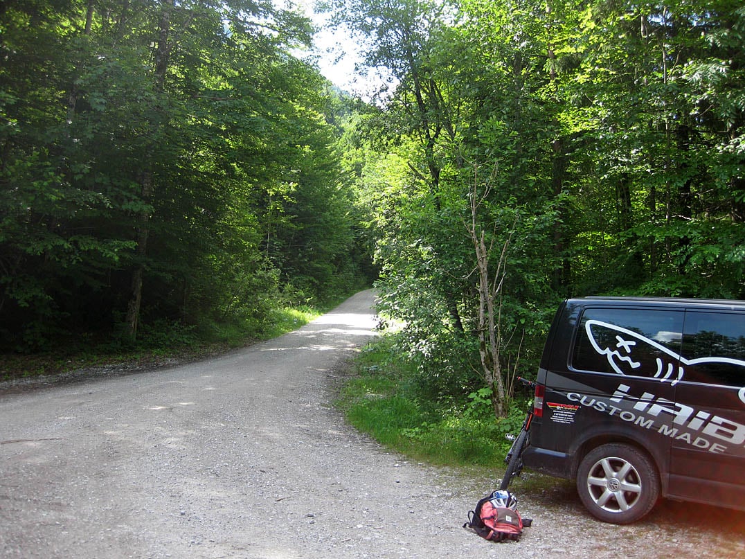 Gleich zu Beginn der Tour führt uns der Forstweg vom Parkplatz an der B13 bei rund zehn Prozent Steigung in den dichten Bergwald hinein. Nach etwa zweihundert Metern weist uns ein Schild den Weg nach Links in Richtung Hochalm und Röhrlmoos (Weg Nr. 638 bzw. 631). Der schattige, dichte Wald spendet uns entlang der teilweise steiler, teilweise flacher verlaufenden Forststraße eine für die heißen Sommermonate angenehme Temperatur und so treten wir zielstrebig in die Pedale. Doch Achtung: Wer hier zu energisch ist, dem fehlen im weiteren Verlauf der Tour womöglich kostbare Konditionsreserven.