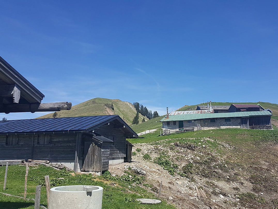 Wir bleiben jedoch zunächst auf dem Fahrweg und folgen diesem geradewegs in Richtung Amperthalalm und Schönberg. Als wir nach etwa dreihundert Metern den höchsten Punkt der Tour, an der Südflanke der Hochplatte (1592m), erreicht haben, geht es fürs Erste wieder bergab. Dabei verlieren wir entlang des nächsten Kilometers hinunter etwa einhundert Höhenmeter. In der Senke angekommen, in der die Amperthalalm (1400m) ihre ruhige Lage abseits der gut besuchten Ziele genießt beginnt für uns der vorzeitige Endspurt hinauf zur Schönbergalm (1420m), die wir nach nicht ganz einem Kilometer erreichen. Rund um die private Almhütte bietet der freie und weitläufige Wiesenhang unterhalb des Schönberg (1620m) ausreichend Platz um eine gemütliche Rast einzulegen. Es empfiehlt sich ausreichend Verpflegung mitzubringen, da entlang der beschriebenen Strecke keine unmittelbaren Einkehrmöglichkeiten bestehen.