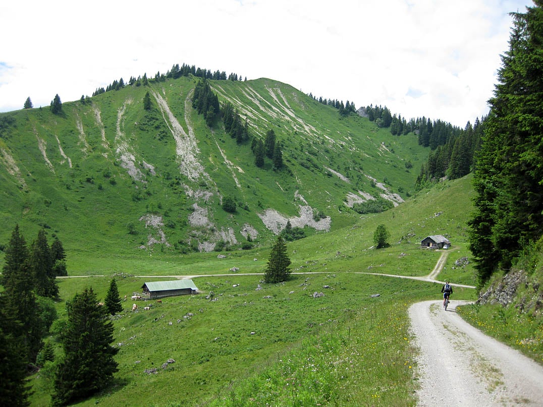 Entlang der etwa viereinhalb Kilometer langen Teilstrecke lassen wir Abzweigungen zur Hochalm oder in den Lenggrieser Ortsteil Winkl unbeachtet und halten uns fortan stets in Richtung Glashütte und Röhrlmoos. Die Beschilderung leitet uns schließlich irgendwann gegen Ende der genannten Etappe in einen augenscheinlich verwaisten Waldweg. Wir folgen diesem, fahren durch die üppige Vegetation, biegen links über eine kleine Brücke ab und finden uns nach rund dreihundert Metern schließlich auf einer geteerten Straße wieder. Der Zufahrtsstraße die linker Hand von Lenggries Fleck in Richtung Röhrlmoos verläuft folgen wir nach Rechts in östlicher Richtung für etwa einen halben Kilometer weiter bergauf, bis wir schließlich am Eingang zu einem weitläufigen Almgebiet ankommen.