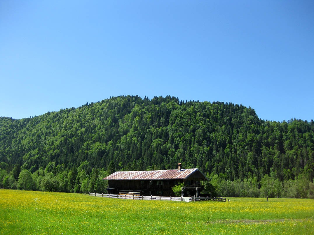 Einen schier endlos lang wirkenden Kilometer gilt es also zu überwinden. Wer hier schiebt, braucht sich aber gewiss nicht schämen. Und zum Glück ist die Passage so abrupt zu Ende wie sie begonnen hat als wir oben schließlich aus dem Wald herauskommen und damit in das Röhrmoostal einfahren. An der Rehgrabenalm (865m) halten wir uns dann gemäß Beschilderung links in Richtung Sylvensteinspeicher.