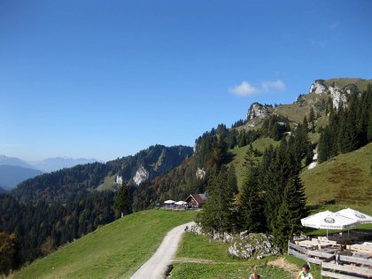 Nachdem wir die ersten rund dreihundert Meter des Pfades und somit schließlich auch den höchsten Punkt der Tour hinter uns gebracht haben, geht es anschließend kontinuierlich bergab. Hierbei ist Vorsicht geboten! Links des Weges fällt das Gelände teilweise steil ab und es gilt daher besonders an Stellen an denen man sich nicht sicher fühlt, einfach abzusteigen und zu schieben. Noch flott zwei kleine Brücken überquert und schon breitet sich eine großzügige Lichtung vor uns aus - das Gebiet rund um die Rautalm (1036m). Die Alm gehört seit 1924 der Knorr-Bremse AG und wird daher nur privat genutzt. Fragt man aber freundlich bei den Hüttengästen nach, darf man sich sicherlich gerne für eine kleine Rast dort aufhalten.