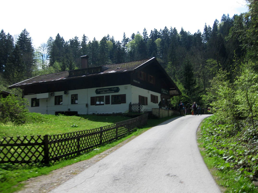 Kurz darauf umfahren wir die Berggaststätte "Bauer in der Au" (904m), ein traditionsreiches und beliebtes Ausflugsziel mit gemütlichem Biergarten auf einer sonnigen Almwiese inmitten der Tegernseer Berge gelegen. Da wir seit Tourbeginn jedoch erst knapp zweieinhalb Kilometer zurückgelegt haben, folgen wir schließlich der Forststraße ohne eine gemütliche Einkehr im Biergarten. Auf den nachfolgenden vier Kilometern fahren wir vorbei an großflächigen Almwiesen, überqueren hier und da einige Bächlein und kommen schließlich nach etwas bergauf und bergab an der privat bewirtschafteten Luckengraben-Alm (944m) vorbei. Umrahmt vom Gipfel des Bettstein (1272m) im Osten und Ochsenkamp (1595m), Auerkamp (1607m) sowie Spitzkamp (1603m) im Westen verläuft der Kiesweg kurz hinter der Alm ein weiteres Mal ansteigend bergauf und erreicht auf circa siebenhundert Metern sogar Spitzen von rund sechzehn Prozent Steigung.