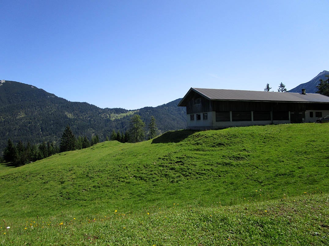 Wer noch nicht genug hat, folgt wie wir der Forststraße rechter Hand an der Alm vorbei weiter bergauf. Ein Schild weist uns den Weg in Richtung "Pasill-Alm", "Pasill-Sattel" und "Pletzach-Alm". Etwas mehr als zwei Kilometer treten wir nun, mit zwischenzeitig kurzer Talfahrt, hinauf in das idyllische Almgebiet am Fuße der Seebergspitze (2085m), genießen dabei den malerischen Ausblick auf die umliegenden Berghänge des Vorkarwendels und das unter uns gelegene Oberautal an dessen höhergelegenen Talschluss die Kaserstattalm (1440m) zu erkennen ist. Am höchsten Punkt der Tour angekommen, geht es entlang des achthundert Meter langen Endspurts gemütlich hinab zur Pasillallm (1557m). So angenehm dies auch momentan erscheinen mag, so darf man nicht vergessen, dass man die soeben verlorenen siebzig Höhenmeter bei der Rückfahrt dennoch zu bewältigen hat.