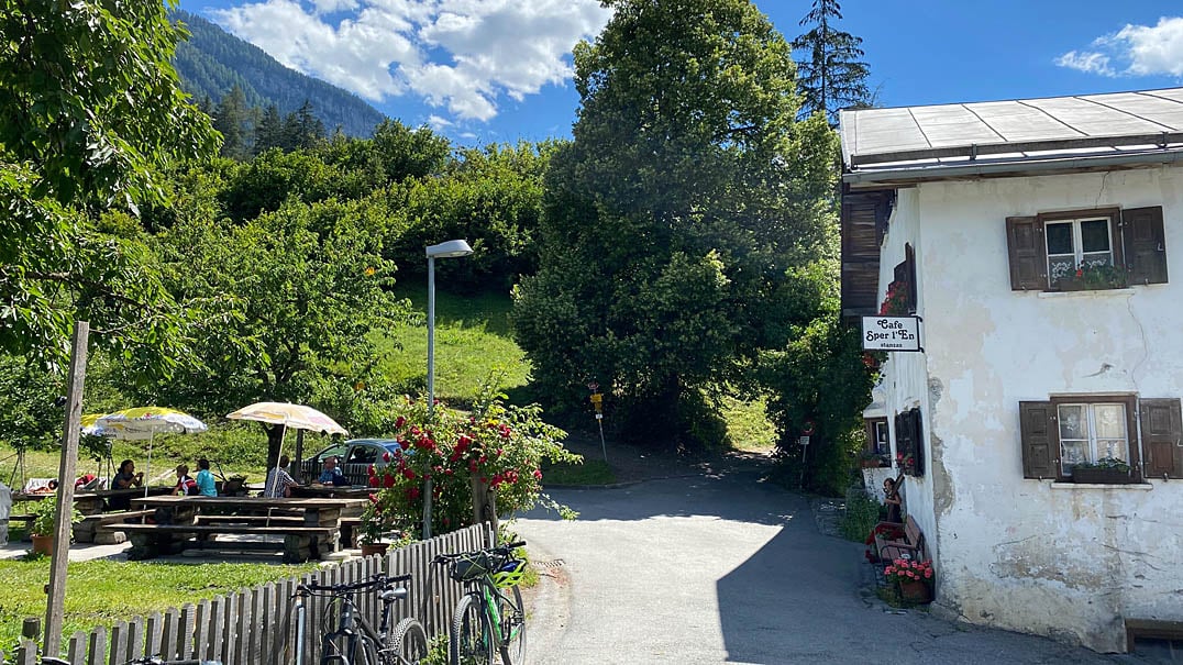 Im kleinen Ort fahren wir rechts und biegen vor dem Campingplatz erneut rechts in einen Forstweg ein, der uns alsbald am Inn entlang flussabwärts in Richtung des Ortes Strada-Martina führt. Als wir am Café Sper l'En (1071m) vorbeikommen, überqueren wir kurz darauf den Inn auf die gegenüberliegende Seite, fahren anschließend gleich rechts und unmittelbar links unter der Schnellstraße hindurch um auf der geteerten Ortsstraße in die beschauliche Fraktion Martina zu gelangen.