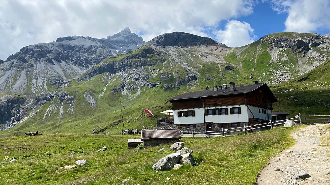 Oben angekommen eröffnet sich uns ein Panorama der Superlative. Während sich zu unseren Füßen das soeben durchquerte Schliniger Tal erstreckt, blicken wir in das von unzähligen imposanten Gipfeln umsäumte Sesvennahochplateau, durch welches fortan unsere Route verläuft. Etwa einen halben Kilometer weiter passieren wir die Alte Pforzheimer Hütte (2256m), eine ehemalige Alpenvereinshütte die seit 2015 als Museum dient, sowie die benachbarte Sesvennahütte (2262m).
