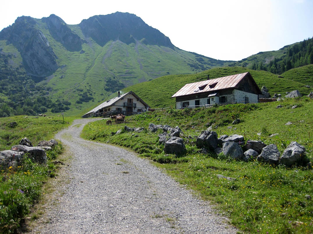 Schon bald darauf biegen wir hinter einer augenscheinlich verlassenen Waldhütte links ab und folgen dem Forstweg bergan. Auf den ersten hundert Metern bis zu einer Abzweigung erreicht die Steigung bereits etwa fünfzehn Prozent im Mittel und dies wird sich auch nach Passieren der Abzweigung nicht so schnell ändern. Knapp zwei Kilometer verläuft der Forstweg entlang des östlichen Berghanges kontinuierlich steil bergan durch den schattigen Wald, ehe wir in das freie Almgebiet der Untersteilenalm (1200m) gelangen, eine landwirtschaftlich genutzte Alm die rechts den Hang hinauf zu erkennen ist. Weitere schweißtreibende eineinhalb Kilometer verläuft der Schotterweg mit stellenweise unangenehm steilem Anstieg und einem nicht sehr vorteilhaften Kiesuntergrund hinauf durch die sich immer mehr öffnende alpine Landschaft bis hinauf zur Schellenbergalm (1320m).