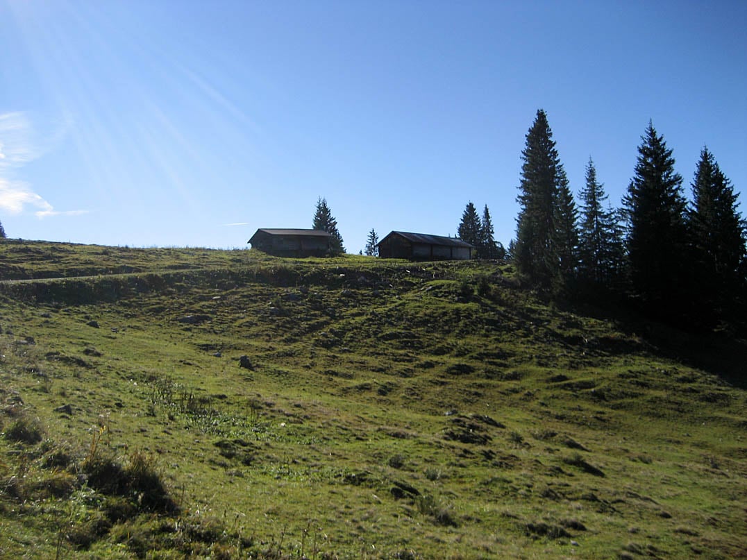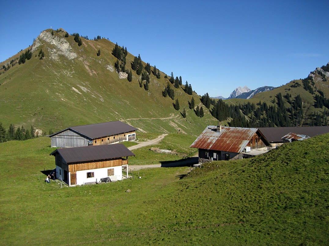 An der sich dort befindenen Abzweigung geht es nach rechts weiter hinauf zu Tiefenbachalm (1602m) und Lochalm-Hochleger (1628m). Der circa viereinhalb Kilometer lange Abstecher mit ein paar kernigen Passagen ist ein absolutes Muss auf dieser Tour - die Idylle der Alpen, das Panorama und der Blick auf nahegelegene Gipfel des Karwendels sind es definitv wert aber wie bereits erwähnt nur ein "Zuckerl", das man je nach Erschöpfungsgrad natürlich auch unbeachtet lassen kann.