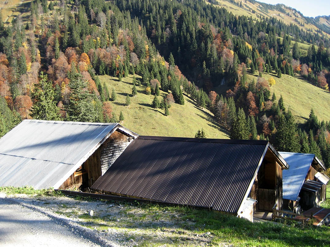 Die gut befahrbare Forststraße bringt uns Meter für Meter hinauf zur Tiefenbachalm-Mitterleger (1320m), welche wir nach weiteren drei Kilometern mit gut vierzehn Prozent Steigung und einigen steileren Passagen bald erreichen. Nach der Alm führt bald ein Weg rechter Hand gute fünf Minuten weit zur Steinölverschwelanlage der Tiroler Steinölwerke Albrecht. Dort wird 180 Millionen Jahre alter Ölschiefer abgebaut und verarbeitet, um Steinöl zu gewinnen. Wen die geologischen Bedingungen sowie der Betrieb interessiert, der sollte einen kurzen Abstecher machen. Wir folgen dem Schotterweg jedoch noch ein Stück weit geradeaus hinauf und erreichen nach eher gemütlichen drei Kilometern, teils bergab, teils leicht bergauf, eine Abzweigung an der Lochalm-Mitterleger (1432m), die sonnenverwöhnt an einer Lichtung liegt und welche sich durch die tolle Aussicht dort ideal zur kurzen Rast anbietet.