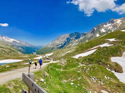 An der Bergbahn genehmigen wir uns eine kurze Verschnaufpause, bewundern den Gletscher zu unserer linken und wagen einen ersten Blick entlang des nach Westen führenden Fahrweges, an dessen Ende sich ganz oben am Grat das Tuxerjochhaus (2319m) befindet. Dort müssen wir hin. Also, rauf auf den Sattel und weiter geht's! Zwei Kilometer und etwa dreihundert Höhenmeter kurbeln wir Tritt um Tritt den steilen Hang hinauf. Einzig in den Kurven wird es vereinzelt etwas flacher, ansonsten zieht der Weg straff bergauf.