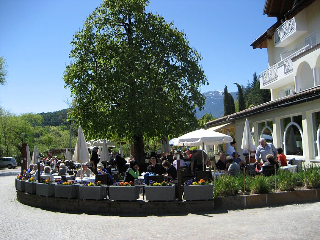 Das Seehotel Sparer (510m) am Westufer des Sees lockt mit einer großzügigen Sonnenterrasse und lädt zur kurzen Rast ein. Wir folgen der Straße entlang des Westufers vorbei am See, bis wir etwa einen Kilometer später an den kleinen Montiggler See und die dort befindliche Jausenstation (541m) gelangen. Nach nur wenigen Metern endet schließlich die Teerstraße und wir biegen links in einen gut präparierten Kiesweg ein. Dieser führt uns nun auf circa zwei Kilometern Strecke mitten durch das Gewirr von Waldwegen in Richtung Rungg und Girlan. Wir verlassen den Wald ein weiteres Mal und erreichen das Sportgelände von Rungg. Unmittelbar dahinter passieren wir eine beschrankte Einfahrt und folgen der Straße und dem darauffolgenden Wanderweg knapp sechshundert Meter vorbei an den Sportanlagen bis zu deren nördlichen Ende. Über den Runggweg fahren wir anschließend weiter nach Girlan (Cornaiano), durchfahren dessen Ortskern und folgen der Straße in südwestlicher Richtung weiter bis wir nach insgesamt circa drei Kilometern Eppan (Appiano) beziehungsweise St. Michael (S. Michele), wie der Hauptort der Großgemeinde Eppan offiziell heißt, erreichen. Vorbei an der großen Kellerei St. Michael folgen wir anschließend dem geteerten Radweg "Bozen - Überetsch", welcher uns zuerst nahe der Umfahrungsstraße und vorbei an der Siedlung Obere Gand, im späteren Verlauf jedoch wieder auf schmalen Straßen durch die dichtbepflanzten Obsthaine führt. Wir folgen der als Radweg markierten Route stets in Richtung Kaltern (Caldaro) und erreichen knapp drei Kilometer nach St. Michael die altbekannte Jausenstation Christl im Loch (421m), fernab vom Straßenlärm, inmitten von Obst- und Weinbergen gelegen. Ein idealer Platz für eine verdiente Rast.