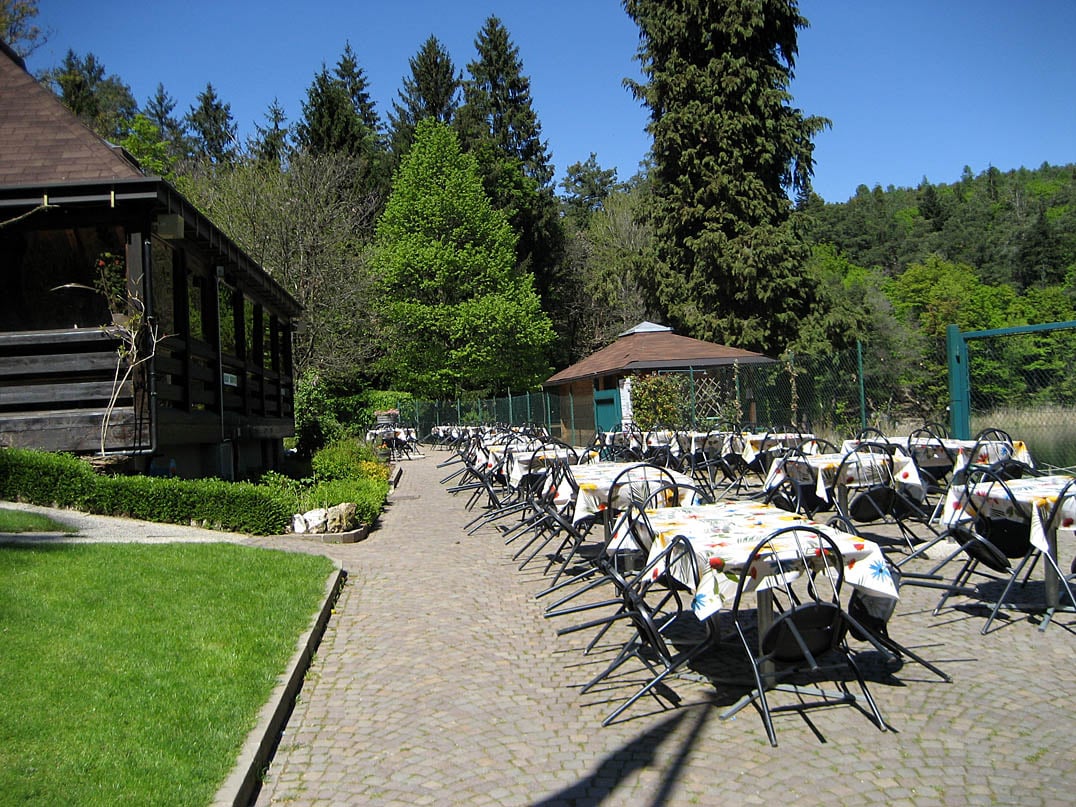 Auf den darauffolgenden zwei Kilometern entlang des geteerten Radweges passieren wir eine historische Dampflok, durchfahren einen kleinen Tunnel und folgen dem Weg weiter nach Süden. Schließlich biegen wir halbrechts in eine für Kraftfahrzeuge gesperrte, schmale Seitenstraße ein. Etwa zwei Kilometer rollen wir nun gemütlich durch die idyllische Natur Südtirols hinunter in Richtung Kalterer See (Lago di Caldaro). Wir erreichen alsbald die Kreuzung, an der wir zu Beginn der Tour in Richtung Montiggl abgebogen sind und folgen hier nun in gerader Richtung der bereits bekannten Strecke zurück zur Hauptstraße nach Klughammer. Wer möchte kann nach knapp dreihundert Metern entlang der Hauptstraße rechts abbiegen und unmittelbar zurück zum Ausgangspunkt fahren. Wir allerdings folgen zunächst der Straße vorbei am Gasthaus Leuchtenburg (239m) und biegen anschließend rechts in Richtung Badestrand Klughammer ab. Unmittelbar am Ufer des wärmsten Badesees der Alpen genießen wir auf der Sonnenterrasse des Gasthof Klughammer am See (225m) die Abendsonne und lassen die ausgedehnte und landschaftlich traumhafte Tour durch das Überetsch Revue passieren.