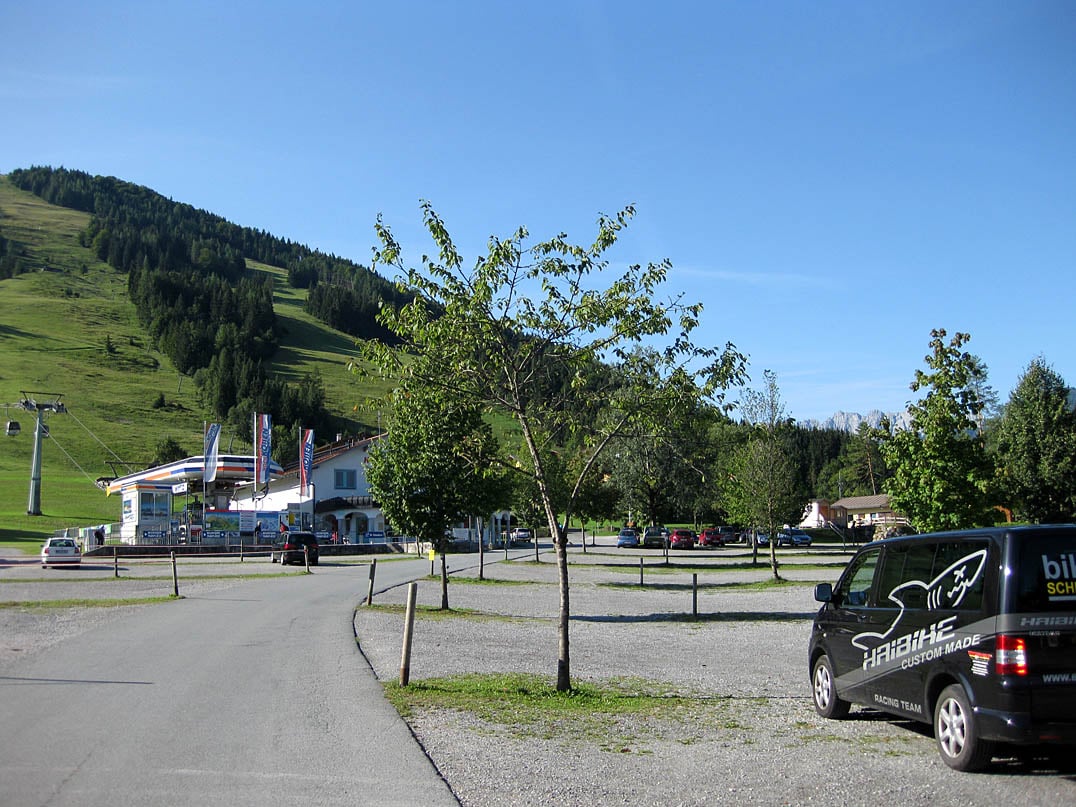 Vom Parkplatz an der Talstation der Bergbahnen Hochkössen steigen wir auf die Bikes und fahren links neben Sigi's Sportklause in den ausgeschilderten Radweg 247 in Richtung Unterberghorn (1773m) ein. Mit Blick hinauf über die freie Wiesenfläche der Skipiste folgen wir dem geteerten Weg vorbei an einer kleinen Kapelle. Nachdem wir knapp einen halben Kilometer bei leichtem Gefälle zwischen den Feldern hindurch gerollt sind, passieren wir den Eingang in den Wald und umfahren eine Schranke. Nach weiteren circa zweihundert Metern zweigt vom Leukental Radweg rechter Hand die Auffahrt in Richtung Unterberghorn und Scheibenwaldhütte ab.
