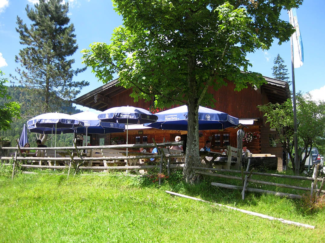 Bei durchschnittlich sechzehn Prozent Steigung treten wir die nachfolgenden zweieinhalb Kilometer kontinuierlich bergauf und erblicken dabei zu unserer Linken die atemberaubende Felskulisse der nördlichen Karwendelkette. Langsam flacht der Weg schließlich wieder ab und wir können rechts der Forststraße den Neubau der Krinner-Kofler-Hütte (1391m) von 2004 unterhalb der Soiernspitze (2257m) erkennen. Nur wenige Meter später fahren wir ein in das weitläufige Almgebiet der Vereiner Alm (1406m). Die bewirtete Alm, auch unter den Bezeichnungen Fereinalm, Fereinsalm oder Vereinsalm bekannt, kommt uns als Einkehrmöglichkeit mit gemütlichem und schattigen Biergarten sehr gelegen. Wir genießen die Idylle der und so gönnen wir uns eine gemütliche Rast auf der gut besuchten Almhütte.