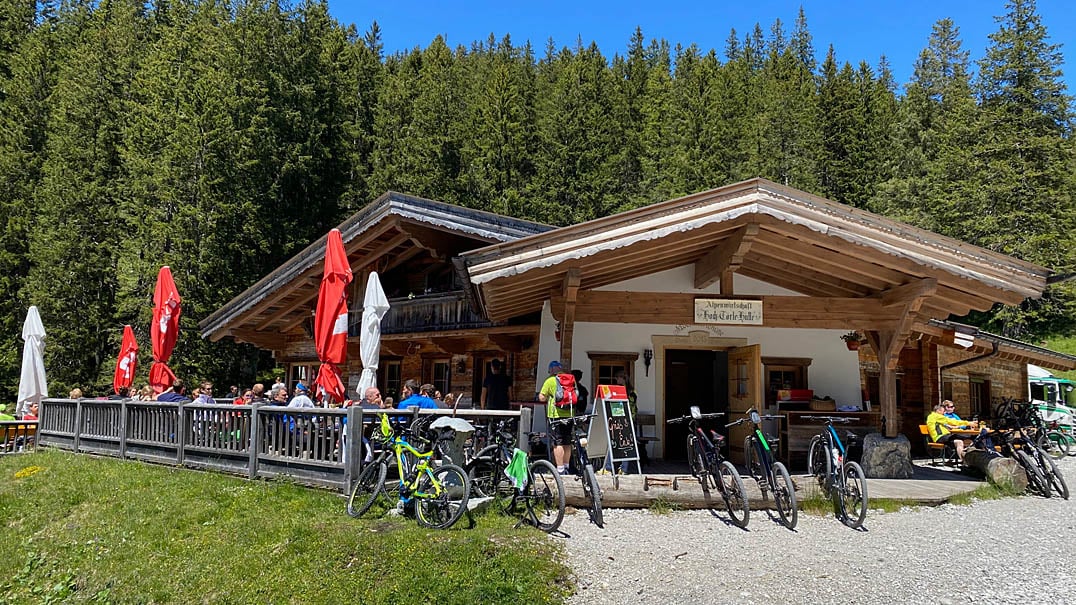 Die neben der Bergstation gelegene Ehrwalder Alm (1502m) markiert zugleich den Beginn des Gaistals, welches zwischen Wettersteingebirge im Norden und Mieminger Kette im Süden von Ehrwald im Westen bis nach Leutasch im Osten verläuft. Wir folgen der Beschilderung geradeaus weiter und fahren über den Forstweg noch etwa eineinhalb Kilometer bergauf, bis wir schließlich den höchsten Punkt dieser Tour erreicht haben. Auch wenn ein kleiner Abstecher zum beliebten Seebensee locken würde, so entscheiden wir uns doch dafür, an der darauffolgenden Kreuzung der MTB-Route 551 durch das Gaistal hindurch nach Leutasch zu folgen. Wir genießen die beschauliche, erholsame und landschaftlich traumhafte Abfahrt durch das Tal, vorbei an Tillfußalm (1382m) und Gaistalalm (1366m), die zu einer Einkehr einladen.