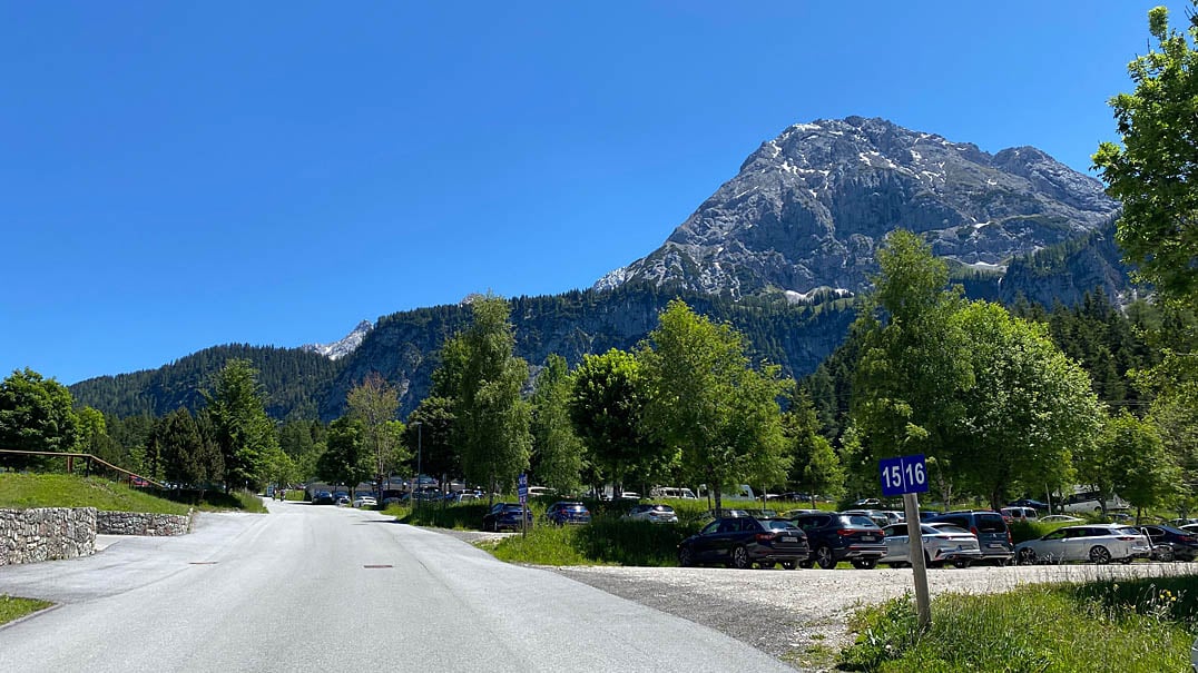 Nach zehn Kilometern durch das Almgebiet passieren wir den Parkplatz Salzbach (1246m) und folgen anschließend der Teerstraße durch die Leutaschklamm hindurch bis in den Ortsteil Plaik. Dort finden wir auch eine MTB-Servicestation mit diversen Werkzeugen sowie eine Ladesäule für E-Bikes. Auf einer langen Tagestour wie dieser gewiss für so manchen ein nützlicher Umstand und Grund genug einen kurzen Zwischenstopp einzulegen. Als wir unmittelbar gegenüber der Brücke über die Leutascher Ache hinweg folgen, biegen wir wenige Meter weiter im Ortsteil Obern in den mittleren Weg ein, überqueren anschließend die Straße hinüber zum dort ansässigen Hofladen und gelangen über den Mooser Weg aus dem Wohngebiet hinaus auf freies Feld.