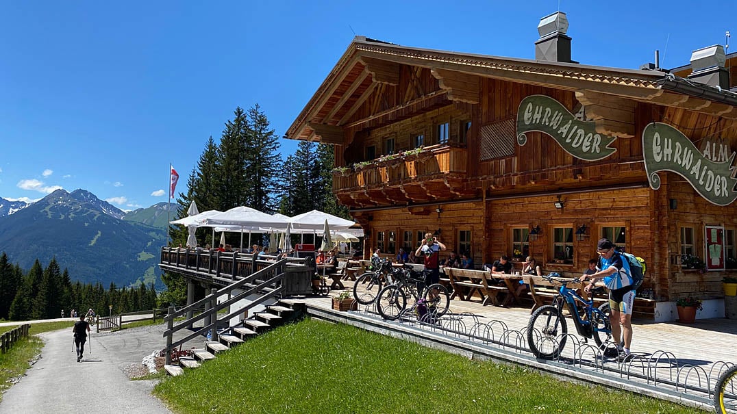 Im Wohngebiet angekommen, geht es über die Reinhard-Spielmann-Straße weiter bis in den Ortskern des beschaulichen Ortes Ehrwald. Dank der dort befindlichen Beschilderung finden wir unseren Weg in südöstlicher Richtung vorbei am Martinsplatz und über die Doktor-Ludwig-Ganghofer-Straße bis zur Talstation der Ehrwalder Almbahn. Während an der bewirteten Brentalm (1113m) der nach rechts verzweigende Weg in Richtung Hoher Gang für Radfahrer gesperrt ist, führt eine geteerte Auffahrtsstraße geradeaus und damit zunächst parallel zum Verlauf der Gondelbahn in den Bergwald hinein. Mit durchschnittlich rund fünfzehn Prozent Steigung geht es fortan knackig bergauf. Kurve um Kurve kämpfen wir uns empor und haben nach ungefähr drei Kilometern das Schlimmste überstanden.